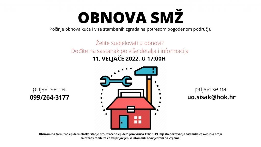 Hrvatska gospodarska komora i Hrvatska obrtnička komora pozivaju sve obrtnike i poduzetnike sa područja Sisačko-moslavačke županije koji se bave građevinskim radovima i završnim radovima u građevini, a zainteresirani su za radove na obnovi kuća i više stambenih zgrada na potresom pogođenom području da sudjeluju na sastanku u petak 11. veljače 2022. godine u 17:00.